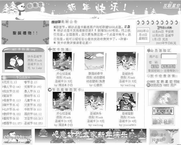 这里有很多设计精美别致的新年、圣诞贺卡,尤其是圣诞贺卡的种类比较多,部分Flash动画贺卡堪称精品,很有圣诞节的气氛。最重要的是,这些都是免费的哟。