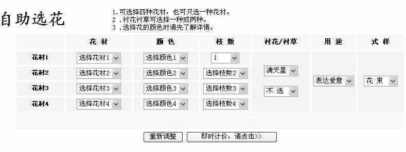 你可以选择四种花材,在每种花材中又提供了13种选择,比如玫瑰、康乃馨等等。在“颜色”中选择相应的颜色;在“枝数”中选择要搭配的花材枝数,从1到1000任你选择;在“衬花/衬草”中可以选择一两种衬花或衬草,比如满天星、情人草等;在“用途”中选择该花型的用途,比如表达爱意、生日祝贺等;在“式样”中选择鲜花式样,比如花束、花篮等。最后,点击“即时计价,请点击”按钮就可以计算出合计价格以及打折后的价格(已包括包装、设计及配送等费用),接着点击“我选好了,下一步”按钮就可以进入上面所介绍的在线订花的第三步,接下来的步骤同上,这样就可以在线完成自助选花的订购。