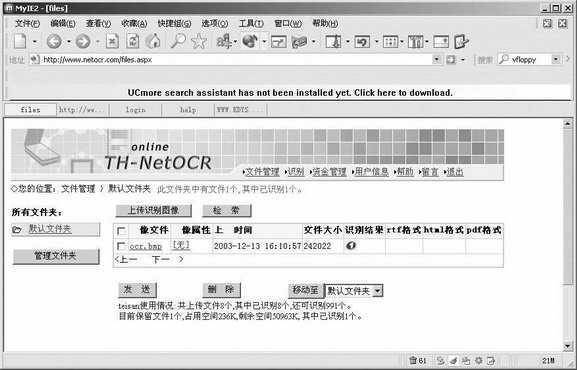 要想使用该网站提供的服务,必须先注册,登录网站后点击“注册”按钮即可进行注册。完成注册后,输入用户名、密码即可登录至用户文件管理页面(图1)。在文件管理页面中我们可以对上传识别后的文件进行各种管理操作,如查看识别后的文字,删除识别后无用的图像,发送识别文件至用户信箱,或者是针对文件夹的管理(添加或删除文件夹等操作)。