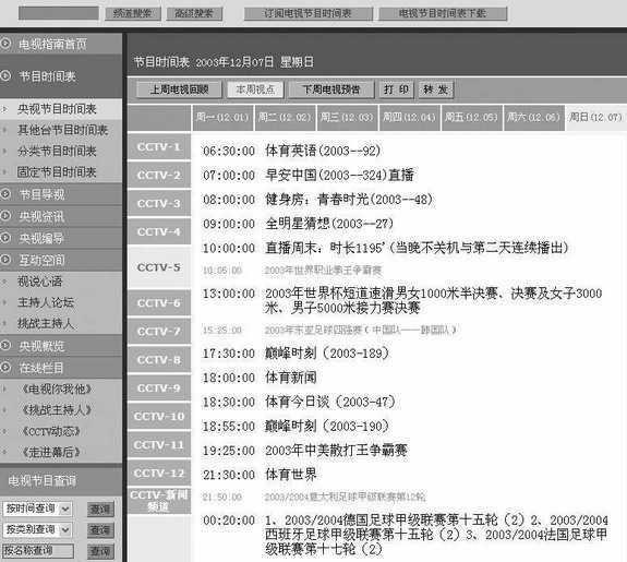 点击页面右侧的“节目时间表”可以看到央视从周一到周日所有频道的详细节目时间表。比如要查看本周日中央五套(体育频道)的电视节目,你可以先点击节目表上方的“周日”,再点击“CCTV-5”,接着就可以看到该频道当日的所有节目了(图1)。你如果还想回顾上一周播放的电视节目,可以点击页面上方的“上周电视回顾”按钮。
