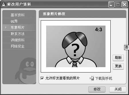 在“个人设定”的左侧窗口中多出了“形象照片”一项。点击该选项,在右侧窗口中就可以设定我们真正的形象照片了(如图)。点击“更换”按钮,QQ将会自动进入到QQ交友中心页面。在该页面左侧点击“维护个人资料”,在个人形象照中选择合适的照片,并确定在客户端显示形象照片。
