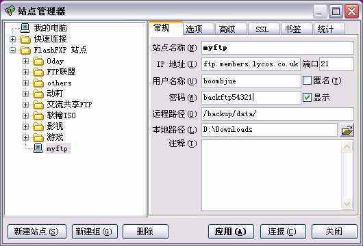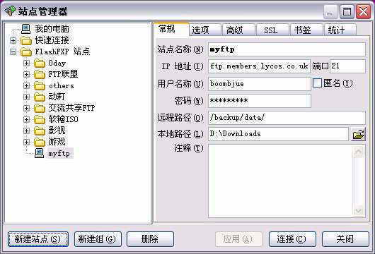 2.如果想每次都进入站点的特定目录(例如笔者的myftp是个人备份文件,每次链接必定进入backup/data下进行操作),可以选择输入“远程目录”。本地路径是默认的上传下载地址。只要链接到这个站点,就自动在主界面左方窗口打开设定的目录,以方便操作。