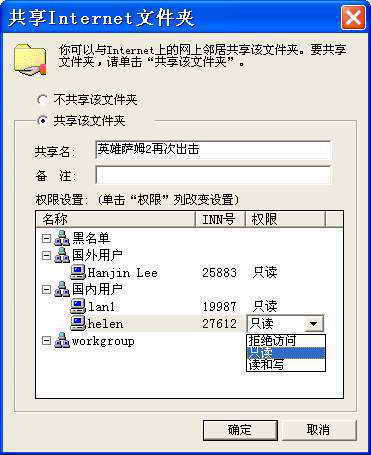 如果想要共享本地文件也很容易。打开“资源管理器”,在要共享的文件或文件夹上单击右键,选择“共享为INN目录”,就可以打开“共享Internet文件夹”对话框(图2),选择“共享该文件夹”,再单击“权限”为每个用户设定合适的管理权限,按“确定”即可添加共享。