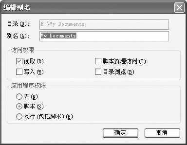 IIS安装后,在查看文件夹属性(右键单击文件夹选择“属性”)时,我们可以发现属性对话框中多出一个“Web共享”标签项。选中需要共享的文件夹,在其属性对话框内的“Web共享”标签项中,勾选“共享文件夹”,随后弹出一个“编辑别名”对话框(图1),在“别名”项中输入该文件夹在局域网中显示的名称,在“访问权限”中系统提供了读取、写入、脚本资源访问、浏览目录四个多选项,建议勾选“读取”项,其他选项可根据需要选择。在“应用程序权限”中选择“无”,最后点击“确定”退出。