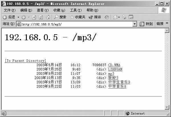 以后我们就可以在该局域网内的其他计算机上,通过在IE地址栏中输入要访问计算机的IP地址和共享文件夹名称(如http://192.168.0.5/ My Music),并回车后,就能看到该文件夹中的所有内容(图2)。我们还可以单击该文件夹中标有“<Dir>”字样的链接,访问下一级文件夹中的内容,如果要想将某一个文件保存到自己的计算机中,我们可以单击右键选择“另存为”即可。