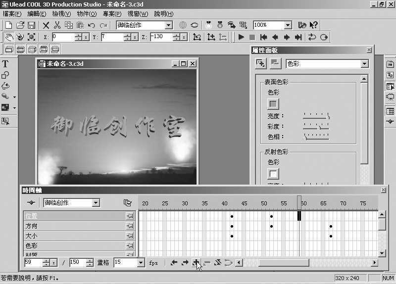 6.在第120帧处添加关键帧,将文字移动到下部并调整其方向让其正立,随后我们将调整其颜色:在时间轴上单击“色彩”,调出“属性面板”,设置其“表面色彩”、“反射色彩”及其亮度、彩度、色相、光泽等(本例中将文字的表面色彩设置为红色)。