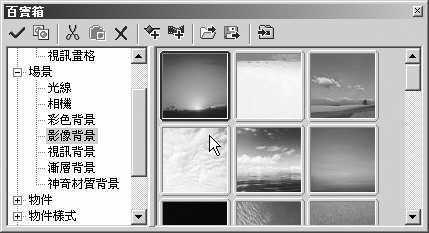 1.打开“百宝箱”面板,到“场景”下点击“影像背景”,然后从右边的背景列表中选择第一个背景(如图2,这就是夕阳西下时的场面),将它拖动到场景窗口中,你会看到鼠标指针旁有一个加号,放开后当前背景就发生变化了。
