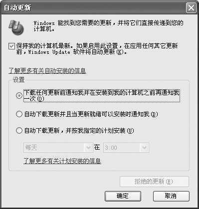 1.“自动更新”就是上面提到的“保持我的计算机更新......”,系统在默认情况下,登录Windows XP的时候,系统总是“保持自动更新”,并会在访问Internet的时候自动下载更新,并且更新就绪可以在安装的时候再通知你。还有,选择“下载任何更新前通知我并在安装到我的计算机之前再通知我一次”项也可以实现半自动更新的。