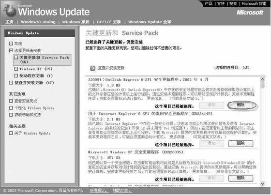 2.“手工更新”就是在我们“关闭自动更新”功能之后,在Windows XP中,选择“开始→所有程序→Windows Update”命令来进行系统的更新。之后系统会自动打开Internet Explorer去登录微软的更新中心──http://windowsupdate.microsoft.com,在搜索更新期间,你可能会收到一个或多个安全警告,单击“是”按钮,点击“扫描以寻找更新”可以对您自己的计算机进行全方位的扫描并寻找更新,过一段时间后,会列出需要更新的项目及内容(包括关键更新、Service Pack、Windows XP、驱动程序更新等),如图3所示。点击列出的更新项目,你可以根据需要来选择安装的更新程序(每个更新都又详细的介绍),单击“添加”按钮可以添加需要安装的项目,单击“删除”按钮可以删除不想安装的更新项目。最后单击“复查并安装更新”按钮就可以列出需要下载并安装的更新项目,单击“立即安装”按钮就可以下载并安装更新项目了。下面你就可以按提示一步一步来下载并自动安装更新项目了,最后重启计算机,完成安装。