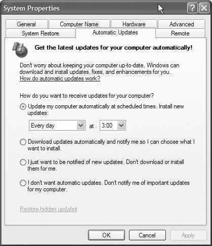 在安装SP2后,进入系统前就会需要你设置系统能够自动获取补丁程序。随后在系统属性对话框的“Automatic Updates”选项卡中,内容也有了一些变化,如图所示。你可以设置系统仅仅检测更新并通知你,而并不下载和安装。