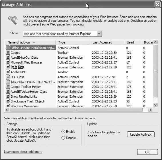 如果你怀疑某个加载项可能会导致IE不稳定,那么就可以在这里选中它然后点击下方的“Disable”。同样,如果你想要检查某个加载项有没有更新的版本,只要选中后点击“Update ActiveX”。