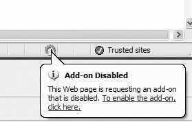 在这里你不用担心如果不小心禁用某个加载项后会对你的网页浏览造成麻烦,因为如果你要访问的网页需要使用一个已经禁用的加载项的时候,IE会在状态栏给你一个通知,你可以看情况启用该加载项。