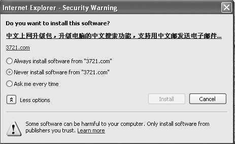 虽然在以前版本中我们可以设置总是信任某个证书,却无法直接总是不信任它。好在SP2中已经对这种问题做出了改进,访问网页时,如果需要安装插件,将会看到上图所示的界面,如果我们永远都不打算安装经过这个证书验证的插件,只要简单地选中“Never Install…”然后点击Cancel就可以了。