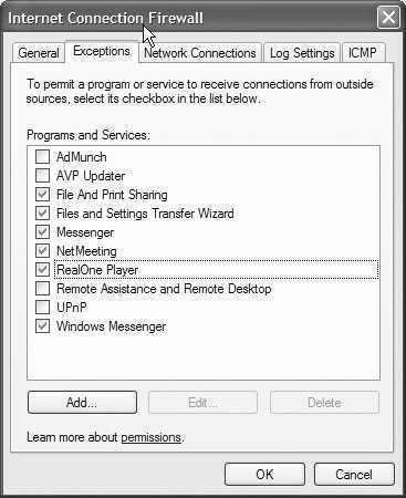 对于某个程序或者系统服务,我们可能并不希望它充当一个服务器,那么就可以在ICF防火墙属性窗口的“Exceptions”选项卡下进行设置,只有你选中的程序和服务才能监听和接受来自网络上的连接。