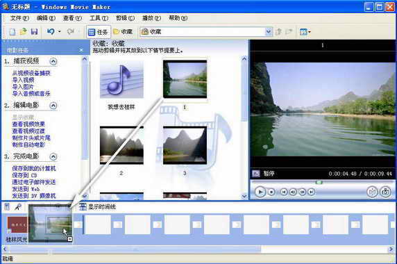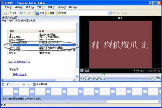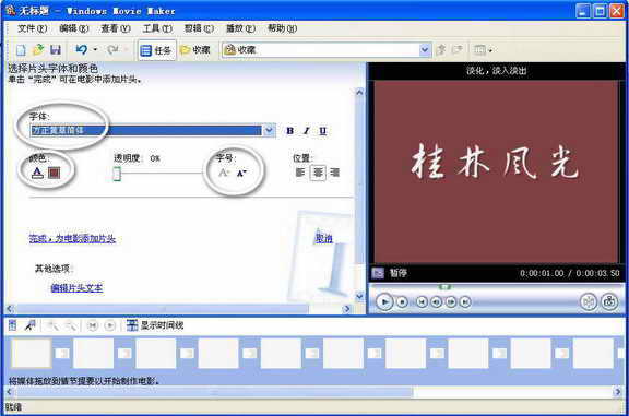 在影片的开始我们先以一个动画开头点明相册的主题,同时也增加相册的气势与完整性。用Movie Maker制作一个片头非常简单,下面就看我们以“桂林风光”为主题制作一个简单的片头吧。