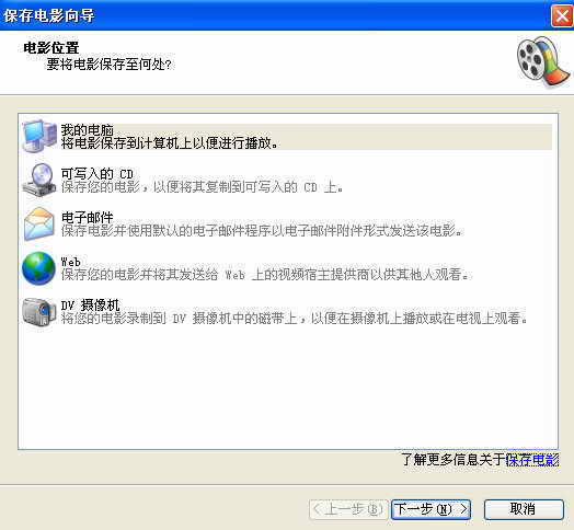 点“文件→保存和发送电影”,在弹出的界面中,你可以看到有几种选择(图8)。在这里你可以将电影保存到计算机或可写入的 CD 上、以电子邮件附件的形式发送给你的朋友。如果你想保存很长的时间,你还可以接上DV摄像机,在这里选择“DV 摄像机”将视频录制到磁带上,然后点下一步跟着设置就可以了。