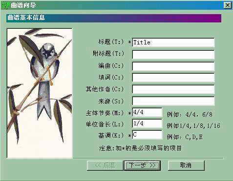 解压安装以后,启动Muse,按下“新建”按钮,会出现一个曲谱向导(如下图),在这里可以输入曲谱的基本信息,如标题、编曲、填词、主体节奏、基调等,然后按“下一步”,选择曲谱类型,包括简谱、五线谱和吉他谱,比如我们选择五线谱,按下“结束”即进入编辑界面。曲谱的编辑方法有两种,一种是脚本编辑,另一种是屏幕编辑,通常我们只用屏幕编辑就可以了,在页面视图下可以看到编辑好的曲谱效果,这有点类似用Frontpage做网页。