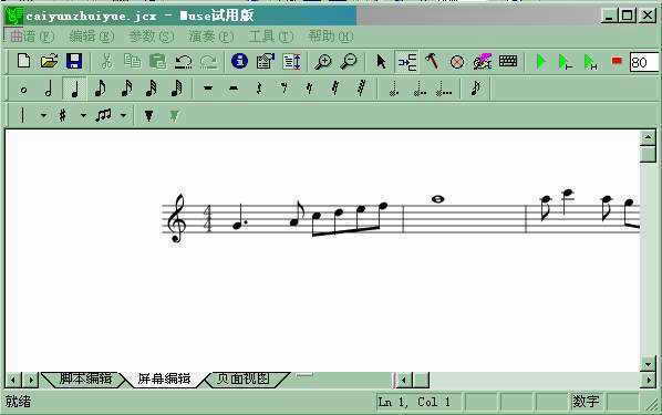 主菜单包括“曲谱”、“编辑”、“参数”、“演奏”、“工具”和“帮助”,主菜单的大部分功能都可以用工具栏第一行的按钮来实现,除了实现菜单功能,工具栏第一行还包括“放大”、“缩小”、“演奏速度”和编辑音符的几个按钮。工具栏第二行是各种常用的五线谱音符,如果编写的是简谱或吉他谱,此行也会出现相应的音符。工具栏第三行是“小节线工具组”、“升降调工具组”以及“符杆和连音工具组”,如果需要用到装饰音,后面还有“添加装饰音”按钮。