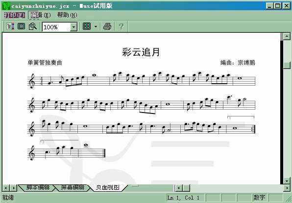 点击“页面视图”,看到了吧(如下图),是不是有点专业水准。如果你做的是简谱或吉他谱,也有同样的效果,而且Muse还有一个功能,就是简谱和五线谱相互转换,在编辑区按鼠标右键,选择“显示简谱”或“显示五线谱”即可完成转换,多么简单。
