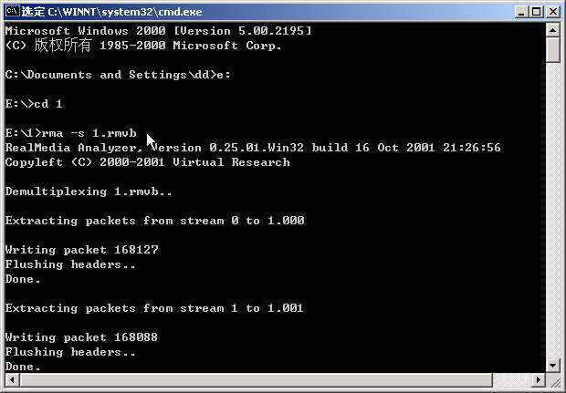 1.输入rma -s 1.rmvb 命令,按回车后程序将会把这个RMVB文件分割为1.000(音频)和1.001(视频)两个文件,源文件还保存在这个文件夹内(如下图)。