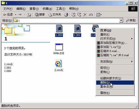 4.最后就可以播放这个修复后的2.rmvb文件了。如果还有延迟问题的话可以重复一下第2步的操作来解决。满意后可以删除源文件1.rmvb和1.000、1.001两个文件以节约空间(如下图)。