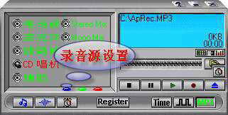 软件在面板上下足了功夫,在功能上也不弱。那么用户如何通过其窗口按钮录音呢?其实非常简单,首先在左上角按钮中选择录音类型,即选Stereo(立体声)还是选Mono,16位和8位两种位率;“Rec Time”设置1分钟以内的录音时间;kHz滑动条即设置生成文件的千赫兹;Volume就是我们熟悉的声音大小滑条。左下方的音乐图标按钮为设置比特率值;波形图标按钮设置开始几秒时的声音大小、动作和延迟时间。右下方的“Time”录音起止功能,用户可以事先设定好录音的起始和结束时间或录音长度。
