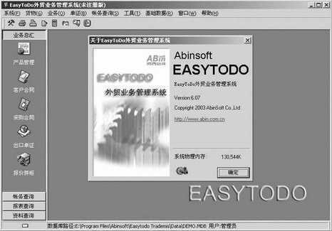 运行该软件,利用初始的用户账号ADMIN和口令PASS即可登录系统。系统的主界面(见图)采用菜单和导航条结合的方式,菜单按照外贸业务的基本流程设计,导航条则相当于系统功能的汇总,包括了业务、账务、报表和资料查询等功能。
