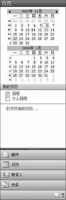 Outlook 2003提供的会议安排查看方式非常灵活。假如你要查看某一段时间内的会议或活动,只需要选中“日历”导航窗格中的相应日期,则对应的日历就会显示在窗口中间,其中不同颜色的标签说明了它的性质和重要性。