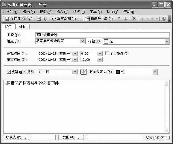 首先在“主题”栏内输入会议名称“高职评审会议”,接着在“地点”栏内输入开会地点“教育局五楼会议室”。如果以前曾经输入过相同或类似的会议地点,可以打开“地点”框右侧的下拉列表从中选择。最后在图2窗口下方输入出席会议需要注意的事项,例如“携带职评档案袋和论文复印件”。