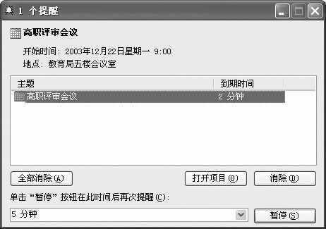 单击图6“暂停”按钮右侧的下拉按钮,从中选择再次提醒的时间间隔,然后单击“暂停”按钮,将图6的提醒对话框关闭,待再次到达提醒时间时,对话框会再次弹出提醒。如果其中的提醒不再需要查看,单击其中的“消除”按钮即可将它从对话框中去掉(日历中的标签仍然保留)。