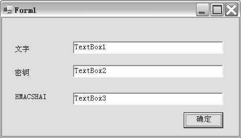 首先在窗口中添加一个Button、3个Textbox、3个Label控件。将Button的Text属性设置为“确定”。将3个Label控件的Text属性设置分别设置为:文字、密钥、HMACSHA1。3个Textbox的属性保持默认。添加控件后的图如下: