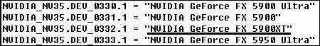 其实早在“5900XT”这个名词出现之前,国内的一些品牌就曾推出过GeForce FX 5900Ultra的降频版产品,其技术规格同如今的5900XT有惊人的相似,只是核心频率为400MHz,比5900XT仅高出10MHz。这类产品一般被人们称作“5900SE”,其称谓同样来自于一款由NVIDIA泄露的雷管驱动的inf文件中。NVIDIA方面对此也一直没有做出正面回应。而“5900XT”选择这个时候出现,一来可以丰富和完善NVIDIA的中高端产品线;二来可以跟NVIDIA早些时候推出的“5600XT”命名互相呼应。真可谓一箭双雕!
