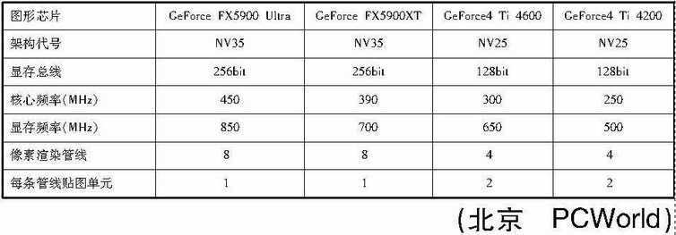 附表:GeForce FX 5900Ultra、5900XT与GeForce4 Ti 4600、4200显卡产品的主要技术参数对比: