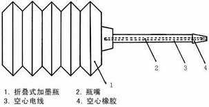 改造方法:首先找一个旧的加墨瓶盖,把瓶盖顶部剪掉一段,使瓶盖通孔成为一小段空心的橡胶管。把这段空心橡胶管的一头削尖,就像圆珠笔的笔嘴一样。把削好的空心橡胶管套在加墨瓶的长嘴端上,使它比长嘴端的出口高出一点点(2毫米)就行了。这时,空心橡胶管与加墨瓶体之间还露出一段瓶嘴。我们用尺子量一下这段露出的瓶嘴长度,约33毫米。剪一段相同长度的电线,抽去中间的铜芯,先套进长嘴上,再套上空心橡胶管(见图)。