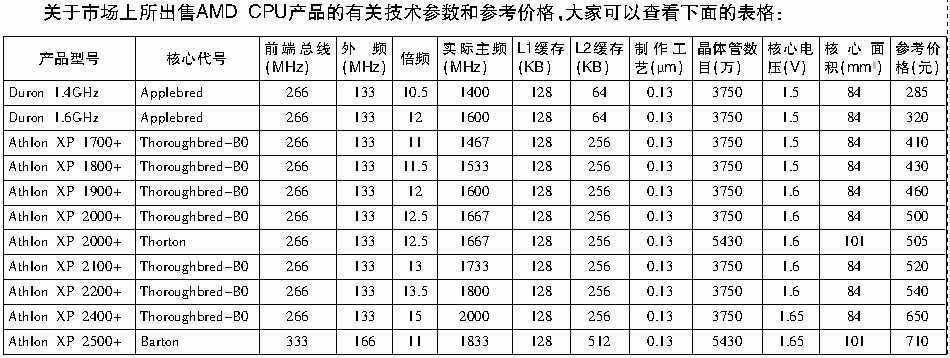 一提起AMD的CPU,许多DIYer的脑海中就会联想到低廉的价格、强劲的性能和极佳的超频潜力。而进入2003年,AMD更是将自家产品的这些优点发挥到了极致。无论是年初时大放异彩的Athlon XP 1700+,还是后来居上的性能强劲备受推崇的Barton核心Athlon XP 2500+,又或是最近可轻松改造的核心代号为Applebred与Thorton的新产品,都不断地给我们惊喜。如今已是2003年末,电脑市场又将迎来今年的最后一个黄金销售时期。拥有极高性价比的AMD CPU也理所当然地成为了许多消费者的首选。下面笔者就对当前市场上AMD的主流产品作一个全面的介绍,希望能够对大家的选购起到一定的帮助作用。