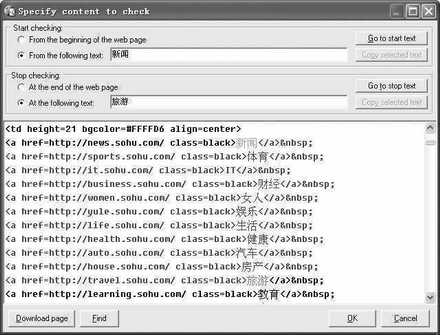 如果你只想对网页的某一部分进行监视的话,那么可以点击“Specify content to check”按钮。在弹出对话框(图1)里的“From the following text”和“At the following text”栏中输入起始部分的文字和结尾处的文字。这时你会在下面的网页代码框中看到起始文字被标记成绿色、结尾处的文字被标记成红色,而中间的部分则为蓝色。这样,我们在每次检查该网页时,就只检查被标记为蓝色的这部分网页代码。