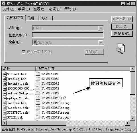优化了启动组后下面我们再来清除一下电脑中的垃圾文件。要区分垃圾文件,我们应从文件的扩展名入手。一般后缀为*.bak、*.??、*.chk、*.fts、*.tmp、*.old、*.xlk的文件都是垃圾文件。删除这些垃圾文件我们可以在“开始→查找→文件或文件夹”中输入“*.bak”文件,在下面的“搜索”项中选择“我的电脑”,随后单击查找即可将硬盘中所有扩展名为bak的文件查找出来,然后将它们删除即可。其他类型的垃圾文件也可以用这种方法进行删除(如图3)。