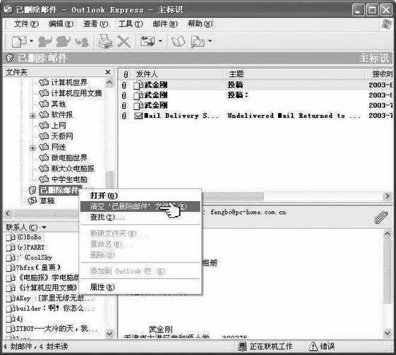 经常用Outlook收发电子邮件,时间一长Outlook中的“收件箱”和“已发送邮件箱”中会保存很多的邮件,对于没有用的邮件(尤其是带附件的)我们可以将它删除。清除这些邮件时按下键盘上的Ctrl键并连续点选需要清除的邮件,随后将其删除到“已删除邮件箱”,如果要想彻底清除这些邮件我们可以右键单击“已删除邮件箱”,在右键菜单中选择“清空已删除邮件箱文件夹”即可将该文件夹中的邮件彻底删除(如图5)。