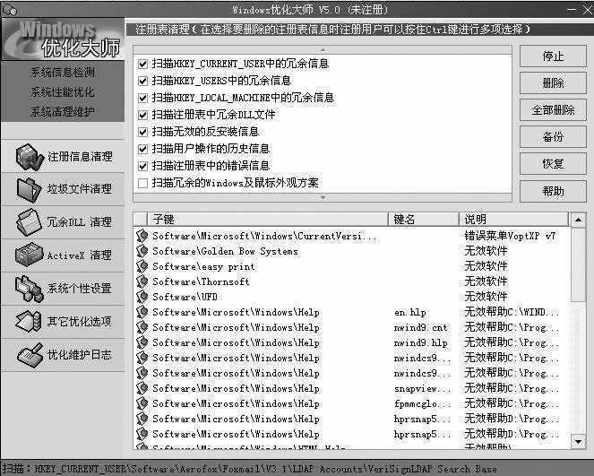 此外,《Windows优化大师》还提供了冗余DLL清理、ActiveX清理等。其清除方法也很简单,在此不再赘述。