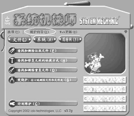 首先在System Mechanic主界面中单击“维护向导”命令(图9),随后弹出维护向导界面,在此我们可以到维护向导中对磁盘垃圾、注册表垃圾、因特网垃圾进行统一清扫。单击“下一步”按钮,选择要清扫的项目,在此建议三项全部选中。选择后我们需要分项进行设置。单击“下一步”首先来对“磁盘垃圾”进行设置。在此选择需要清扫的分区,随后单击“下一步”,在此我们还需要对清扫的垃圾文件类型进行选择,单击“下一步”按钮在此选择垃圾文件的删除方式,程序提供了移动到回收站、永久删除、移到指定的文件夹三种删除方式。磁盘垃圾清理设置后我们还需要依次对注册表垃圾清理、Internet碎片文件清理进行设置,设置后单击“开始”按钮,程序便对磁盘垃圾、注册表垃圾、因特网垃圾进行逐一扫描并清除。