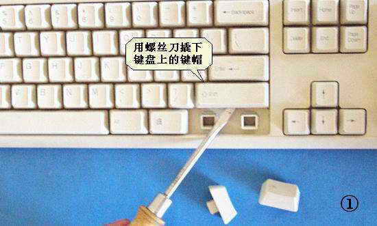 ①清洁键盘时,首先用“一”字螺丝刀撬下键盘上的各个键帽。如果键盘的键帽凹入过深,无法用螺丝刀撬,也可以用尖嘴钳拔。