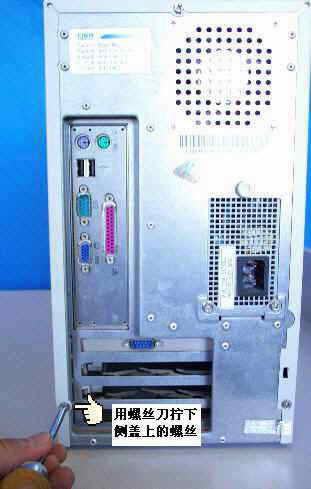 ①首先关掉主机电源,拔下键盘、鼠标、打印机、显示器的连接线。然后用螺丝刀拧下机箱侧盖的螺丝,取下机箱侧盖。
