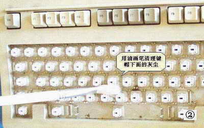 ②将键帽取下之后可以看到键盘中有很多灰尘,用毛刷将这些灰尘清理掉,再使用时就会感觉很轻松了。