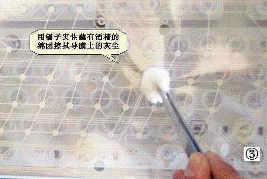 ③键盘正面清洁完,再用螺丝刀拧下键盘背面的螺丝,打开背盖,用镊子夹住酒精棉花团擦拭导线膜。