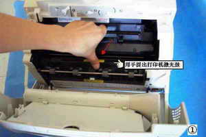 ①以激光打印机为例,关闭电源,用软布或外壳清洁剂将打印机的表面擦拭干净。随后打开打印机侧盖,取下激光鼓。