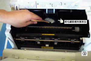 ②用毛刷或油画笔清扫打印机内部及风扇上的灰尘。并用软布轻轻擦掉压纸轴上的灰尘。
