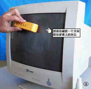 ②如果有条件可以先使用喷雾型屏幕清洁剂,然后再用清洁剂自带的清洁刷按照一个方向擦拭。