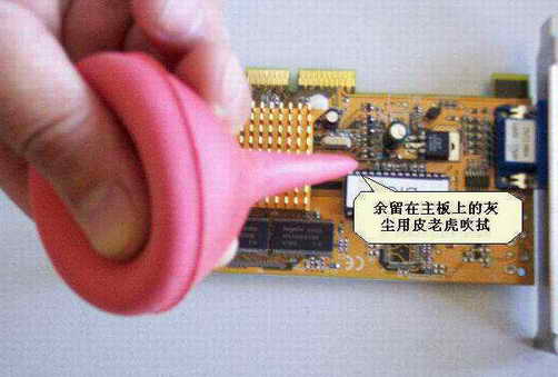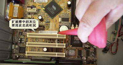 ②随后用皮老虎吹去各个板卡插槽中的灰尘。