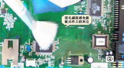 ②用毛刷擦拭电路板上的灰尘,随后用皮老虎吹掉各个元件下部的灰尘。