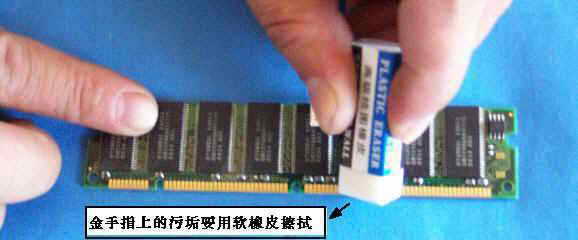 ④一般的板卡都有一排金手指,这排金手指是与主板相连接的地方,如果金手指过脏会影响板卡与主板的接触。所以我们也要定期用软橡皮来回擦拭金手指。擦拭后你会发现擦拭过的金手指比没有擦拭的金手指要光亮许多(用橡皮擦拭金手指时不要用力过大,以免损坏金手指上的金膜)。
